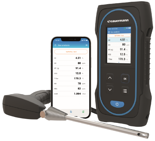 Flue Gas Analyzer dari Sauermann dengans eri Si-CA 030 ini menawarkan semua yang dibutuhkan anda terkait penggunaan pada pemanas yakni untuk memelihara dan memeriksa boiler dengan koneksi nirkabel (wireless) ke aplikasi di ponsel anda dengan pembuatan laporan dan sertifikat servis secara otomatis .